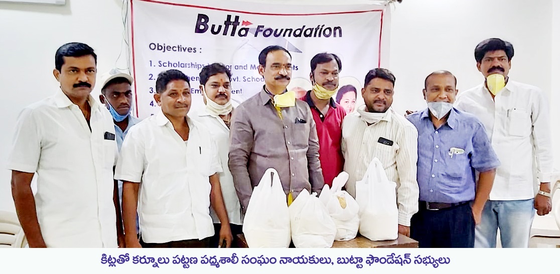 బుట్టా ఫౌండేషన్, కర్నూలు పట్టణ పద్మశాలీ సంఘం సంయుక్త ఆధ్వర్యంలో కర్నూలు నగరంలోని పేద పద్మశాలీ కుటుంబాలకు నిత్యావసరాల కిట్లు పంపిణీ చేయనున్నట్లు పద్మశాలీ సంఘం అధ్యక్షులు, జాతీయ బీసీ సంక్షేమ సంఘం ఉపాధ్యక్షులు కొంకతి లక్ష్మీనారాయణ తెలిపారు. జూన్ 5న సంఘం సభ్యులు కర్నూలులోని బుట్టా ఫౌండేషన్ కార్యాలయంలో సమావేశమయ్యారు. ఈ సందర్భంగా కొంకతి లక్ష్మీనారాయణ మాట్లాడుతూ రూ. 300 విలువ చేసే ఒక్కో కిట్ (బియ్యం, కందిబ్యాళ్లు, చక్కెర, ఉప్మా రవ్వ, ఉల్లిగడ్డలు)ను జూన్ 6వ తేదీ నుంచి చిత్తారి వీధి, కుమ్మరి వీధి ప్రాంతాల్లోని పేద పద్మశాలీయుల ఇళ్లకు వెళ్లి పంపిణీ చేయాలని పద్మశాలీ సంఘం యువజన విభాగం అధ్యక్షులు కొంకతి వెంకటేష్ను కోరారు. 150 మంది కుటుంబాలకు వీటిని అందజేయనున్నట్లు ఆయన పేర్కొన్నారు. ఫౌండేషన్ మేనేజర్ రాజేష్ మాట్లాడుతూ పద్మశాలీ సంఘం గతంలో కూడా 4000 కుటుంబాలకు కూరగాయలు పంపిణీ చేసిందని గుర్తు చేశారు. కార్యక్రమంలో పద్మశాలీ సంఘం కార్యదర్శి వెంకట నారాయణ, కోశాధికారి కాంచానం బాలాజీ, 42వ వార్డు వైసీపీ నాయకులు మదన్ మోహన్, ఫౌండేషన్ ప్రతినిధులు గణప చెన్నప్ప, పేలాల రాఘవేంద్ర పాల్గొన్నారు.
