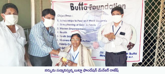 ప్రపంచ నర్సుల దినోత్సవం సందర్భంగా మే12వ తేదీన బుట్టా ఫౌండేషన్ కర్నూలు ప్రభుత్వ ఆసుపత్రిలో పనిచేస్తున్న నర్సులను ఘనంగా సన్మానించారు. ఈ సందర్భంగా ఫౌండేషన్ మేనజర్ రాజేష్ మాట్లాడుతూ కరోనా వైరస్ బాధితులను వైద్యులతో పాటు నర్సులు అందిస్తున్న సేవలు వెలకట్టలేనివన్నారు. కోవిడ్, కాన్సర్ వార్డులో పనిచేస్తున్న స్టాఫ్ నర్సులు, హెడ్ నర్సులు మేరి కళావతి, విమల, సుగుణ, విజయమ్మ, స్వాతి, జ్యోతి, వాణిలను సన్మానించి శ్యానిటైజర్లు అందజేశారు. కార్యక్రమంలో క్యాన్సర్ వార్డు చీఫ్ డాక్టర్ శ్రీకృష్ణ ప్రకాష్, అసిస్టెంట్ ప్రొఫెసర్ డాక్టర్ అంబేద్కర్, ఫౌండేషన్ ప్రతినిధి చెన్నప్ప, బుట్టా ఫౌండేషన్ కోఆర్డినేటర్ చరిత పాల్గొన్నారు.
