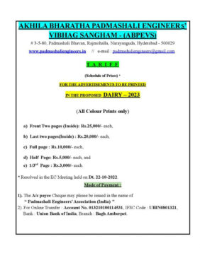 హైదరాబాద్: అఖిల భారత పద్మశాలి ఇంజనీర్స్ విభాగ సంఘం (ఏబీపీఇవీఎస్) 2023 డైరీని ముద్రించనుంది. గత ఏడాదిలాగా ఈ సంవత్సరం కూడా డైరీ లోపలి పేజీల్లో ప్రకటనలు (అడ్వర్టైజ్మెంట్) ముద్రించనున్నారు. అందుకోసం ప్రకటనదారులకు ఆహ్వానం పలుకుతోంది.