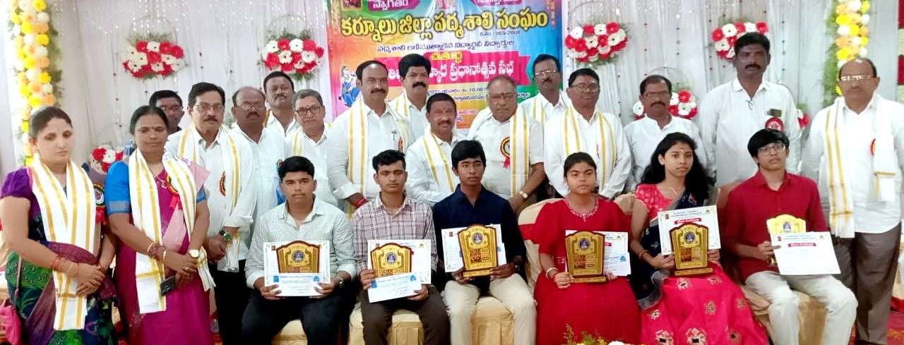 2024-25 సంవత్సరానికి టెన్త్, ఇంటర్మీడియట్లో అత్యధిక మార్కులు సాధించిన కర్నూలు ఉమ్మడి జిల్లా పద్మశాలీ విద్యార్థులకు ప్రతిభా పురస్కారాలను ఆదివారం (జూన్ 1వ తేదీ) అందజేశారు. ఉమ్మడి కర్నూలు జిల్లా పద్మశాలీ సంఘం ఆధ్వర్యంలో నంద్యాలలోని భద్రావతి భావన ఋషి దేవాలయ కళ్యాణ మండపంలో ఈ కార్యక్రమాన్ని ఘనంగా నిర్వహించారు. పదో తరగతిలో మొదటి, రెండో, మూడో విజేతగా నిలిచిన జేరుబండి హారిక, కోటా సంజయ్, తాటికొండ సాయి సందేష్కు వరుసగా రూ.10వేలు, రూ.7,500, రూ. 5వేలు అందజేశారు. అలాగే ఇంటర్మీడియట్లో ప్రధమ, ద్వితీయ, తృతీయ స్థానాల్లో నిలిచిన చేపూరి క్రిష్ణ చైతన్య, దండు స్వీకృతి, గడ్డం సాయి మణిదీప్కి వరుసగా రూ.10వేలు, రూ.7,500, రూ. 5వేలు అందజేశారు. కన్సోలేషన్ బహుమతిగా 110 మంది విద్యార్థులకు ఒక్కొక్కరిని రూ. 2వేల చొప్పున నగదు, ప్రశంసా పత్రం, మెమొంటో అందజేశారు.