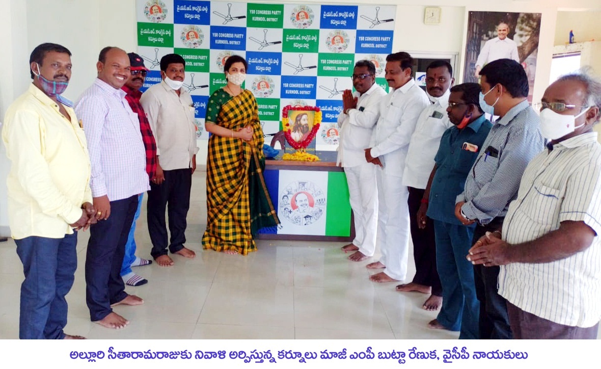 దేశ స్వాతంత్య్రం కోసం ఆంగ్లేయులపై పోరాడిన అల్లూరి సీతారామరాజుకు కర్నూలు మాజీ ఎంపీ బుట్టా రేణుక ఘనంగా నివాళి అర్పించారు. జూలై 7వ తేదీన కర్నూలులోని వైసీపీ కార్యాలయంలో అల్లూరి చిత్రపటానికి పూలమాల వేశారు. కార్యక్రమంలో ఆమెతో పాటు పార్టీ నాయకులు, బీసీ విభాగం రాష్ట్ర ప్రధాన కార్యదర్శి ధనుంజయ ఆచారి, బీసీ సంఘం నాయకులు బత్తుల లక్ష్మీకాంతయ్య, జాకీర్ హుస్సేన్, జానీజాకోబ్, బ్రహ్మయ్య ఆచారి, ఎరుకలి రాజు, గడిగా ప్రసాద్, బుట్టా రాజేష్, నాయక్, మద్దిలేటి పాల్గొన్నారు. Quantumai
